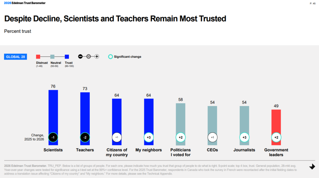 El informe también deja lecturas interesantes sobre las figuras en quienes más confiamos. A la espera de tener los datos de España, a nivel global vemos que científicos y profesores son quienes sacan mejor nota, pese a un ligero descenso respecto a 2025. Los líderes gubernamentales suspenden en confianza.